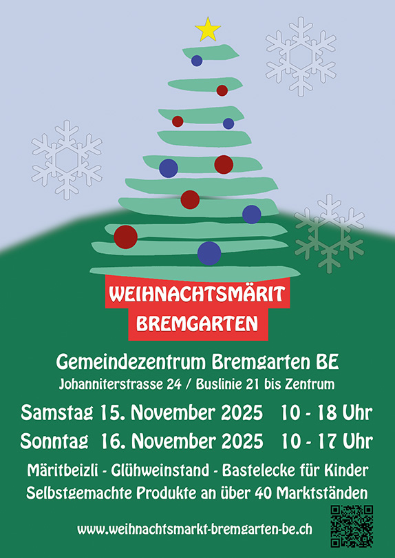 Endlich ist es wieder soweit. Der traditionelle Weihnachtsmärit Bremgarten findet am Wochenende vom 15. und 16. November statt. Über 40 Austellerinnen und Aussteller freuen sich im festlich geschmückten Saal auf Ihren Besuch. Im Märitbeizli und einem Glühweinstand bewirten euch wiederum Nina und Janic mit Team.